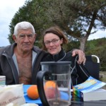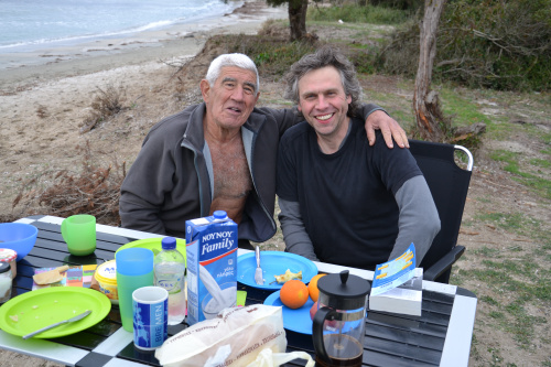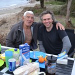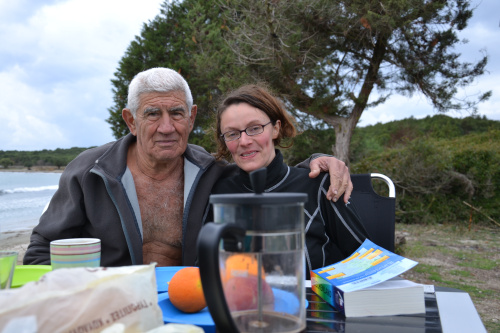 Als wir das erste Mal in die Odysseus-Bucht fuhren, waren wir noch beim Auskundschaften und suchten zunächst einen Campingplatz, wo wir unsere Wäsche waschen konnten. Daher verließen wir die Bucht erst einmal wieder. Dabei kam uns ein älterer Mann mit freiem Oberkörper in einem blauen VW Golf Pickup entgegen, blieb stehen, kurbelte sein Fenster herunter und fragte uns: „Warum wegfahren?“ Ich vermutete zunächst, dass es sich um den Besitzer des lokalen Strandcafés handelte und antwortete beschwichtigend: „Wir suchen einen Campingplatz, kommen aber vielleicht wieder.“