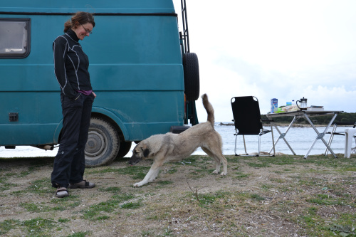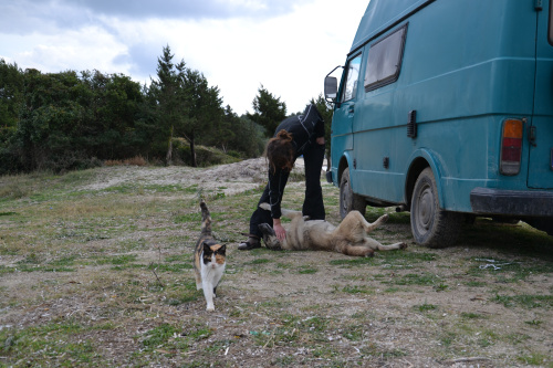 Auch die ausgewilderten Tiere statten uns regelmäßig Besuche ab, obwohl ihr Interesse eher in unserem Essen liegt. Wir haben beschlossen, eine halb verhungerte junge Katze, die uns mit ihrem herzzerreißenden Miauen angebettelt hat, mit Katzen-Hartz-IV aufzupeppeln. Kirke wird nun jeden Tag von uns zweimal mit Katzenfutter verköstigt. Irgendwie hat sich das jedoch über den Strandfunk wie ein Lauffeuer verbreitet, so dass mittlerweile bis zu fünf ausgewilderte Hunde uns belagern. Teilweise werden sie mit ein bisschen Brot davon abgehalten, auf das Katzenfutter loszugehen, teilweise muss ich sie mit wilden Gesten und einem Stock in der Hand verscheuchen.