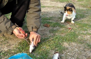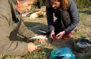Theo machte das Feuer an und zeigte mir Großstadtpflanze, wie man einen Fisch ausnimmt. Das fand nicht nur ich hochspannend. Kirke bekam die frischen Innereien.