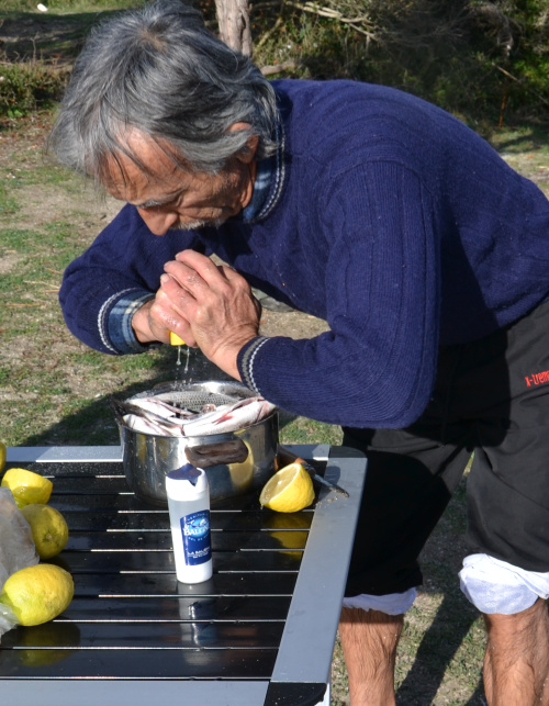 Mit Salz und Zitrone würzte Theo dann den sauberen Fisch. Zitronen hatten wir nach einer Woche Odysseus Bay und unzähligen Gastgeschenken zu Genüge.