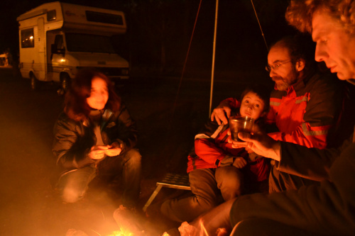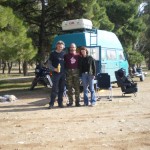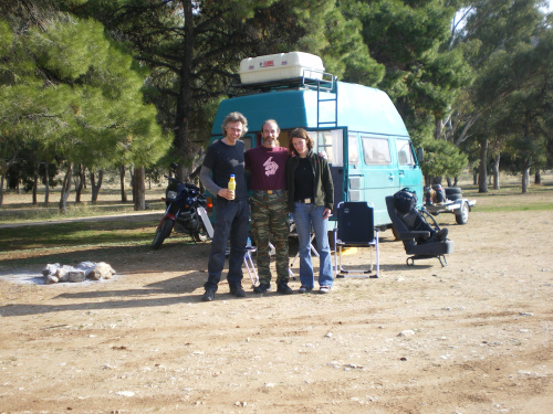 Als wir am 27.12. abends am Strand von Karathona südlich von Nafplion ankamen, waren wir nicht die einzigen, die dort übernachten wollten. Direkt an der Zufahrt zu der ausladenden Bucht stand ein Pulk von Wohnmobilisten. Wir kamen sofort ins Gespräch und es stellte sich heraus, dass einige von ihnen des fortgeschrittenen Englisch mächtig waren. Besonders mit Nikolas hatte ich sehr viele Schnittstellen zum Austausch. Zunächst wurden wir in das beheizte Gemeinschaftszelt eingeladen, später dann landeten Sylvia und ich im Wohnmobil von Nikolas und redeten noch bis spät in die Nacht. An den darauf folgenden Tagen stellten wir unsere Autos etwas abseits von der Horde und verbrachten mehrere Abende am Lagerfeuer, zum Schluss zusammen mit Nikolas Frau Efi und seinem Sohn Dimitri, die er noch aus Korinth nachgeholt hatte.