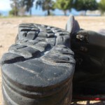 In dieser Zeit habe ich sie nur einmal zum Schuster gebracht, weil sich die Sohlen leicht lösten. Nun musste ich feststelle, dass sich beide Sohlen deutlich vom Schuh abgelöst haben. Eigentlich sind die Dinger damit durch, doch ich gebe noch nicht auf. Mit demselben Kleber, mit dem wir die Dachrinne vom Bus abgedichtet und das Solarpanel auf dem Dach befestigt haben, habe ich jetzt die Sohlen wieder angeklebt. Das hält ganz prima. Sikaflex-252 ist der einzige käufliche Konrad-Spezial-Kleber.