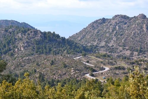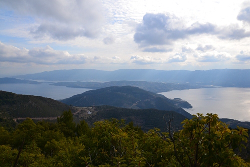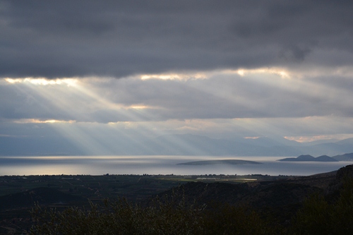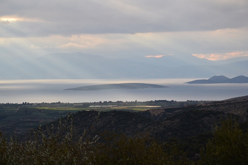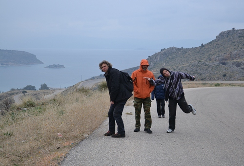 Einen Tag später fuhren Karsten und ich weiter Richtung Halbinsel Methana. Auf dem Weg dorthin fuhren wir durch die Berge, wo wir das wechselhafte Wetter voll abbekommen haben. Dort oben gab es Schneeregen. Klasse war der Blick runter auf das Meer, vor allem, wie sich die Sonnenstrahlen ihren Weg durch die Wolken suchten. Wir übernachteten im kleinen Hafenort Ermioni. Dort haben wir Margarethe aus Linz kennengelernt. Sie ist pensioniert und seit rund sechs Wochen mit ihrer Hündin Fallina im Wohnmobil unterwegs. Den Wagen hat sie sich erst kürzlich gekauft, um eine neue Art des Reisens auszuprobieren. Sie hatte eine ähnliche Route wie wir, durch Kroatien, Montenegro, Albanien. Sie wird auch noch Bulgarien und Rumänien besuchen, dann aber über den Kosovo zurück nach Österreich fahren.