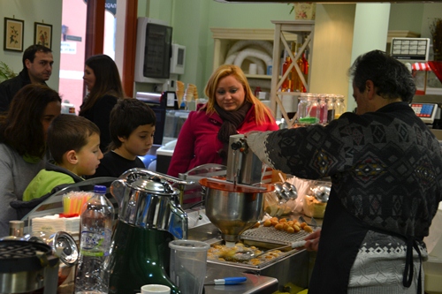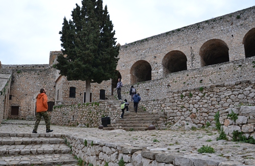 Mit Efi, Nikos, ihrem Sohn Dimitri, Janis und seinem Sohn Tassos gab es einen Sonntagsausflug in die auf einem 200 Meter hohen Felsberg gelegene Befestigungsanlage Palamídi in Náfplion. Die Anlage wurde Anfang des 17. Jahrhunderts von den Venezianern erbaut und diente auch erst als solche. Später dann, noch bis Anfang des zwanzigsten Jahrhunderts, diente sie als Staatsgefängnis. Nikos überraschte uns mit der Info, dass sein aus Mani stammender Urgroßvater hier einige Jahre eingesessen hat. Anschließend gingen wir noch in die Altstadt Náfplions, um Lukomades zu essen. Dieses Fettgebäck erinnert an deutsche Krapfen, nur kleiner. Serviert werden sie mit allem möglichen: Honig und Mandelstücke, weißer oder dunkler Schokoloade, Likör und vieles mehr. Man genießt sie warm, sie schmecken großartig. Die Kinder konnten es gar nicht erwarten und sahen gebannt zu, wie das Gebäck für uns vorbereitet wurde.