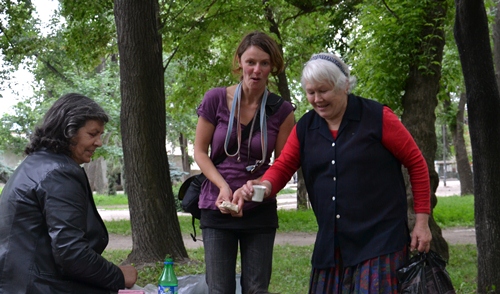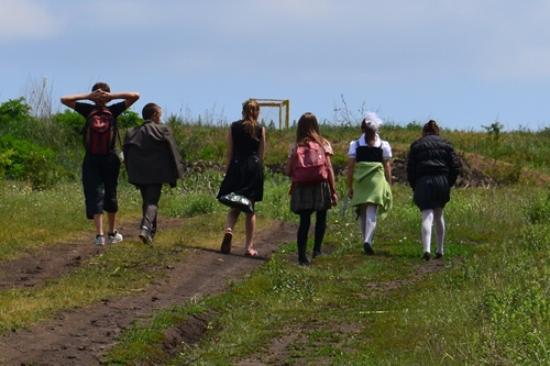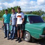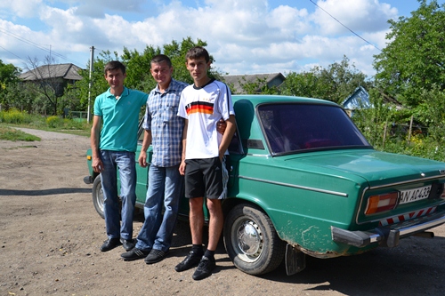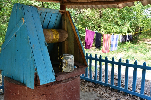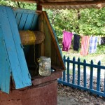Schulkinder auf dem Heimweg. Der nächste Ort mit einer Schule war einige Kilometer entfernt. – Ein Pferdekarren in der Landschaft. – Ein Fußballfan. – Kartuscha und Valerie gabeln mich im Park auf und laden mich ein zu Wurstbrot und selbstgemachten Likör. – Mein Waschtag mit Grundwasser aus einem ausgesprochen tiefen Brunnen.