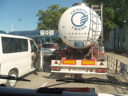 Jetzt gerade stehen wir schon wieder vor einer Schranke in einem Hafen bei Kerch, im äußersten Osten der Krim. Wir verlassen die Ukraine Richtung Russland mit der Fähre. Das heißt, das haben wir vor. Die Papiere sind auf dem Papier in Ordnung. Wir haben Visa für Russland und eine aktuelle und offizielle ukrainische Gesundheitsbescheinigung für den Hund. Doch werden die grimmigen Grenzer auf der russischen Seite sang- und klanglos die Geschäftsvisa akzeptieren? In unserem Aufzug? Spannend…