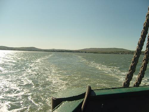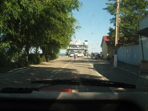Auf der Fähre. Schnell die Einreisekarte für Russland ausfüllen, die wir von den Ukrainern in die Hand gedrückt bekommen haben, um noch ein Foto draußen zu schießen.