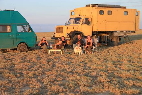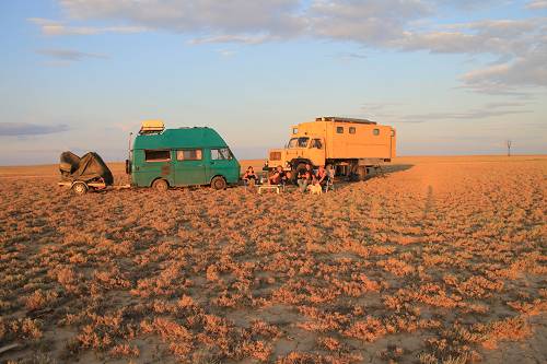 Im Zentrum der Stadt lernen wir Eckehart und Sylvia (www.mercury-nomaden.net) kennen, ein Pärchen aus Norddeutschland, die mit ihrem 50 Jahre alten Magirus Deutz auf einjähriger Asienrundreise sind. Wir verbringen mehrere Tage miteinander und trennen uns erst wieder nach einer Nacht in der Steppe hinter Atyrau. Sie fahren weiter Richtung Usbekistan, während wir dem Weg nach Almaty folgen.