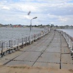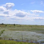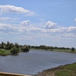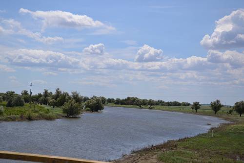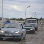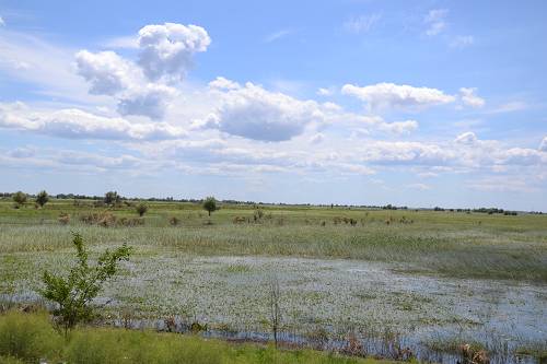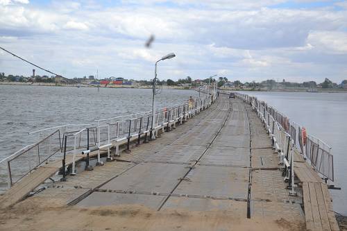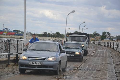Nachdem wir die Moskitohochburg Astrachan in Russland verlassen haben, queren wir das Wolgadelta. Hier sehen wir die Brutstätten der Parasiten und fahren über eine Pontonbrücke. Wir spekulieren, dass die Brücke nur im Sommer aufgebaut ist und die Autos im Winter über diesen zugefrorenen Seitenarm der Wolga fahren.