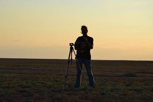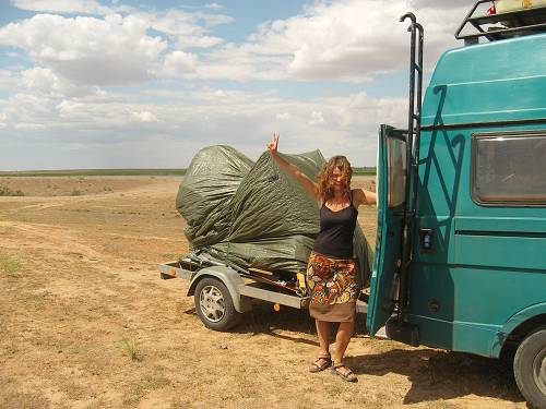 Der erste Halt in der Steppe von Kasachstan entlockt sogar Sylvia eine Pose.