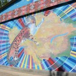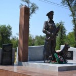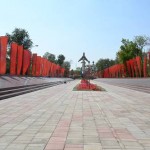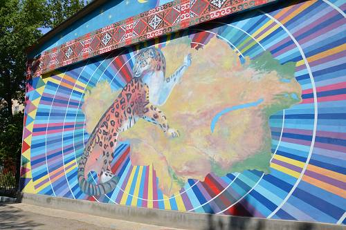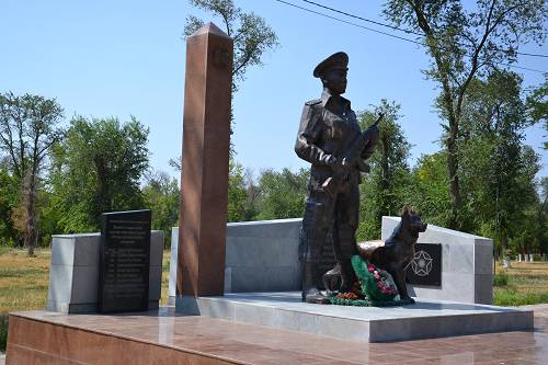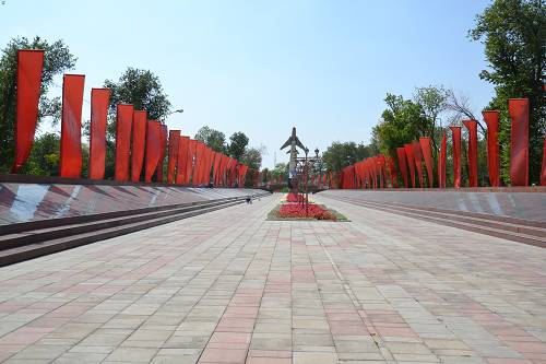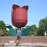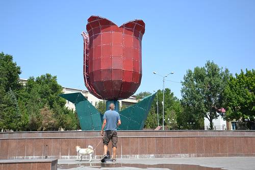 In Schymkent laufen wir durch die Straßen, sehen Brunnen mit einer riesigen metallenen Tulpe, fotografieren lustige, postsowjetische Wandbemalungen und landen in einem Park mit Kriegsdenkmälern für einen Krieg, in dem Mensch und Hund Seite an Seite gekämpft haben.