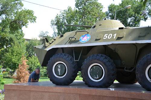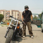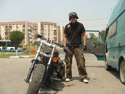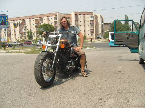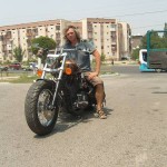 Am nächsten Tag suchen wir in Taras einen Bankomaten und Autogas. Da hält ein Biker an und fragt uns in perfektem Englisch, ob wir Hilfe brauchen. Er nennt sich Russell. Wir kommen ins Reden und ich darf auch mal auf seiner Kiste sitzen, denke aber, dass sie nicht zu meinem Haarschnitt passt. Er erzählt, dass vor ein paar Tagen ein Biker aus Ungarn hier vorbeigekommen sei. „Roland“, rufe ich laut aus und er grinst mich an. Ja, er hätte sich mit ihm angefreundet. Unglaublich. Roland haben wir 1.500 km von hier in der Wüste getroffen. Russell fährt mit uns durch die halbe Stadt, um einen Bankomaten und eine Autogastankstelle zu finden.