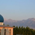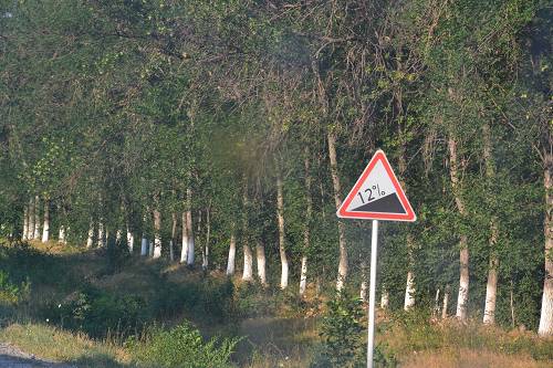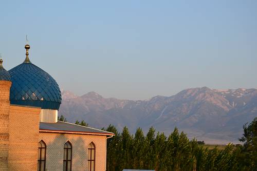 Die Landschaft verändert sich. Hinter einer Moschee tauchen plötzlich Berge auf, und die Straßen werden hügeliger. Allerdings sind die angekündigten 12 % meistens gelogen. Anscheinend wurden von diesen Schildern irgendwann einmal zuviele hergestellt, und dann hat man sie einfach vor jedem Anstieg, den man noch locker im 4. Gang fahren kann, aufgestellt. 50 km vor Taras landen wir an einem Stausee und lernen den Russen Paul und seine Angelkollegen kennen.