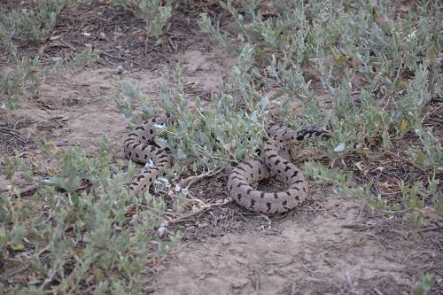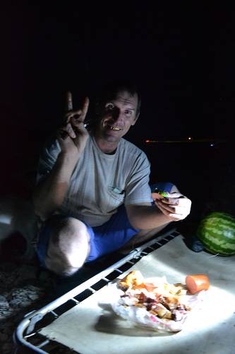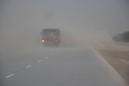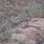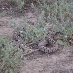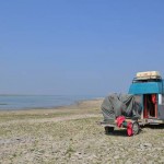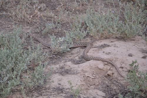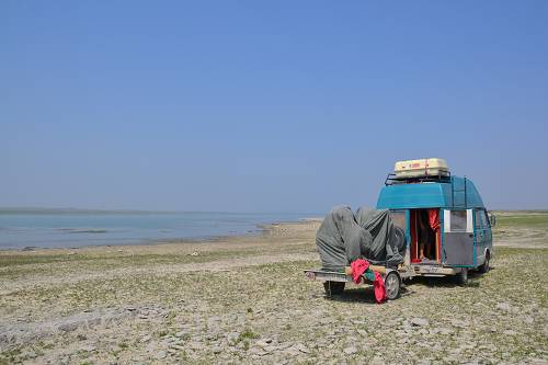 Auf der weiteren Fahrt Richtung Almaty geraten wir in einen Sandsturm. So etwas Widerliches! Man sieht teilweise nichts mehr, wirklich gar nichts mehr, und der Staub zieht durch jede noch so kleine Ritze ins Auto. Am abendlichen Standplatz 500 Meter neben der Straße sehen wir unsere erste Schlange. Sie ist ca. 1,5 Meter lang, und statt abzuhauen richtet sie sich auf und zischt nach uns. Ich werfe mit kleinen Steinen nach ihr, was sie dazu veranlasst, sich in ihr Erdloch zurückzuziehen. Wir stellen den Wagen für die Nacht 100 Meter weiter.