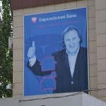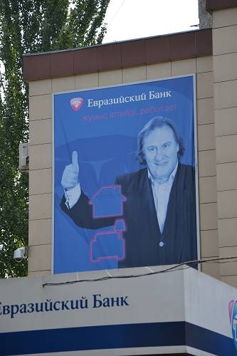 Am nächsten Morgen beschließe ich, dass wir noch am selben Tag Almaty erreichen. Ich will endlich ankommen. Die letzten 360 Kilometer sollten auf den halbwegs guten Straßen in einem Tagewerk zu machen sein. Die Straßen sind leider doch nicht so gut und teilweise mit Schlaglöchern und Bodenwellen vermint. Das Unterfangen wird eine ziemliche Plackerei und zehrt an unseren Nerven. Wir kommen trotzdem an und lernen als erstes, welche Bank Gerard Depardieu preferiert.