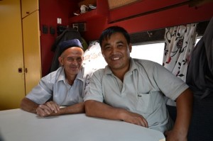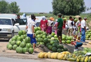Wir stehen etwa zehn Kilometer südlich von Almaty am Fuße des Tian Shan-Gebirges. Dies ist ein guter Ausgangspunkt für all die Checkereien, die jetzt vor uns liegen: Ersatzteile besorgen, Auto reparieren, Kontaktlinsen für Sylvia besorgen, Reiseführer Kirgistan von der Post abholen (zum ersten Mal Poste Restante bestellt, bin gespannt ob es geklappt hat), Zahnarzt (mir ist letzte Woche ein Schneidezahn abgebrochen), Karsten braucht dringend eine neue kurze Hose (und einen neuen Haarschnitt, bei dem Thema ist er aber stur). Ich freu mich auch auf einen Einkauf in einem überteuerten Supermarkt mit Luxus-Produkten wie Käse, Oliven und Gemüse. Wir essen seit Wochen Brot, Wurst, Eier, Fischkonserven, Bohnen, Tomatenpaste. Als einziges Gemüse gibt es Tomaten, manchmal Gurken. Und täglich essen wir Melonen, denn unsere beiden kasachischen Mitfahrer Galymhan und Samchan haben uns in Turkestan gleich sieben Stück davon geschenkt.