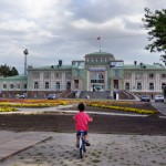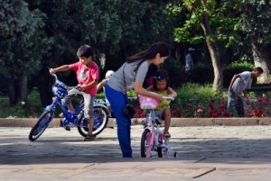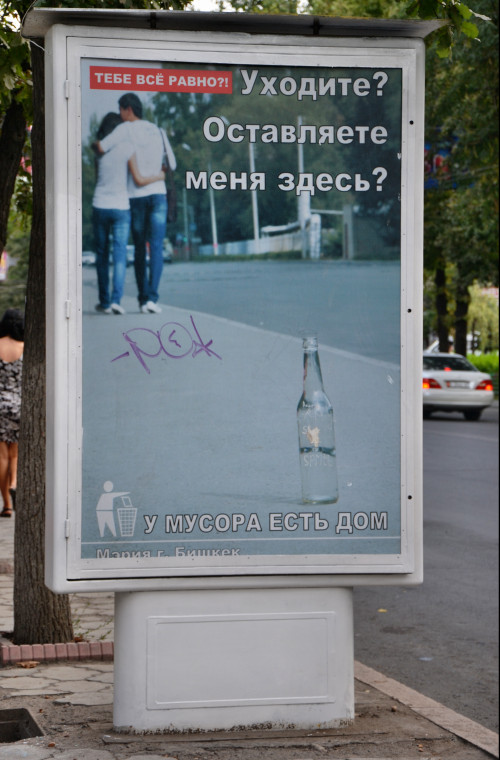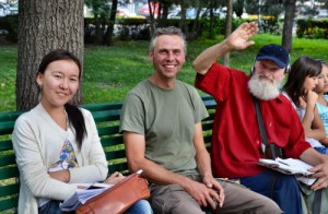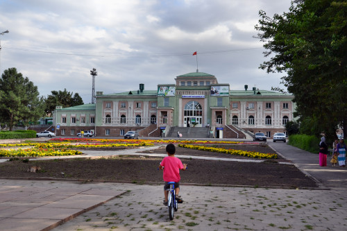 Bei einem Spaziergang durch die sehr grüne Stadt sahen wir den Bahnhof, der von deutschen Kriegsgefangenen gebaut worden ist, die Statue von General Frunze, nach dem die Stadt einige Jahrzehnte benannt war, ein Plakat für Müllerziehung und ein Mädchen, dass gerade Fahrrad fahren lernte. Und wir trafen Nicolai aus Polen, der nach eigener Aussage „the best man of the world“ ist. Um ihn zu treffen, musste ich also erst einmal nach Bischkek kommen. Er ist Schriftsteller und offensichtlich sprachbegabt – er gab der jungen Dame links gerade Englischunterricht.