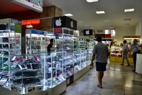 Bevor wir uns am Abend festgefahren hatten, haben wir in Bischkek noch ein paar Dinge erledigt. Zunächst haben wir Geld besorgt. Laut diverser Quellen gibt es nur in Bischkek und in Osch Geldautomaten. Dann waren wir auf der Suche nach einer Sim-Karte für’s Internet und wurden in einem Einkaufszentrum fündig, in dem es außer Mobiltelefonkram nichts anders gab. Es ist schon erstaunlich wie hunderte Lizenznehmer von gerade einmal drei oder vier unterschiedlichen Telefongesellschaften hier um den besten Preis oder Service konkurrieren. Für 1.200 Cum (20 €) haben wir schließlich eine Sim-Karte mit Telefonnummer (Verkäuferin: „Please choose your telefone number.“, Karsten: „I don´t care. Give me anyone.“, Verkäuferin stark verunsichert zeigend auf eine Nummer: „Do you like this number?“ – Karsten an der Nummer völlig desinteressiert nachdrücklich: „Yes, I like this number.“) und 2 GB Datenvolumen erwerben können (Anbieter: Megacom, APN: internet).