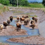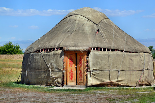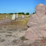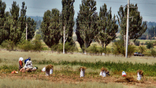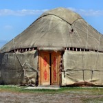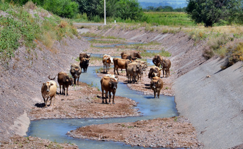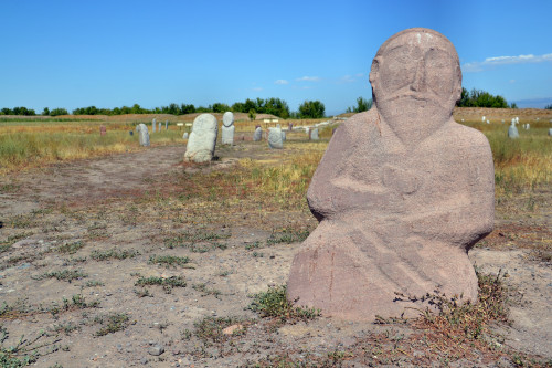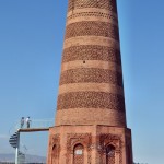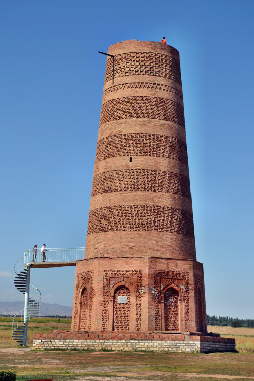 Einen Zwischenstop – etwa 70 Kilometer hinter Bischkek – legten wir in Burana ein. Diese ehemalige Hauptstadt der Karakhaniden wurde im 13./14. Jahrhundert allmählich aufgegeben und verfiel. Heute steht noch der Stumpf eines Minaretts, der auch bestiegen werden kann. Interessant fand ich die Organisation des Freilichtmuseums: Um Zutritt zu dem Turm zu bekommen ging ich in das Büro. Dort saßen drei Frauen beim Plausch. Ich zahlte 40 Com pro Person (ca. 0,65 €) und holte mir den Schlüssel. Besucher, die nach mir kommen, müssen warten, bis ich den Turm bestiegen und den Schlüssel wieder in das Büro zurückgebracht habe. Dann können sie den Schlüssel mitnehmen und so weiter. Auf der einen Seite umständlich für die Gäste (eine der Frauen hätte sich ja auch einfach mit der Kasse vor den Eingang des geöffneten Turms setzen können). Auf der anderen Seite auch irgendwie sympathisch weil vertrauensselig. Zum einen haben sie die Anzahl der Besucher nicht kontrolliert, dich ich beim Kartenkauf angegeben habe. Zum anderen haben sie mir mal eben den Schlüssel zu einer bedeutenden Sehenswürdigkeit des Landes in die Hand gedrückt. Außer dem Minarett gab es noch so genannte Balbals zu sehen. Das sind gesammelte Steinfiguren aus der Umgebung, die – so schreibt mein Reiseführer – vermutlich Bildnisse getöteter Feinde darstellen. Die Jurte beherbergt einen Souvenirladen, den ich nicht selbst aufschließen musste. Eine weitere Sensation war eine Kuhherde im Kanal vor dem Freilichtmuseum. In den umliegenden Feldern ernteten die Menschen Erdbeeren und machten Heu.