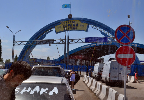 Die Ausreise aus Kasachstan war dagegen weniger spaßig. Fahrer und Beifahrer müssen sich hier trennen. Während Karsten mit den Fahrzeug- und Zollpapieren zwischen verschiedenen Schaltern hin- und herflitschte und sich diverse Stempel abholen musste, stand ich in einem Pulk von Menschen, die alle einen Ausreisestempel haben wollten. Es wurde gedrängelt, gerufen, geschwitzt. Ich war völlig baff als mich schließlich ein Russe fragte, ob ich in der linken oder rechten Schlange anstünde. In meiner sortierten westeuropäischen Wahrnehmung stand ich in einer undefinierbaren, drängelnden Menschenmenge. Ich hatte nicht erkannt, dass es darin tatsächlich eine Ordnung gab, an die sich die Einheimischen orientierten. Erst nach dem Hinweis verstand ich die Systematik, fügte mich ein und kam dann auch tatsächlich meinem Ziel – dem Ausreisestempelschalter – näher. Dort hatte ich dann noch ein „prablem“. In meiner Migrationskarte stand unerklärlicherweise, dass ich nur bis zum 20.07. im Land bleiben würde. Es war nun aber schon der 03. August. Es kam ein Vorgesetzter. Dann noch ein Vorgesetzter. Ich glaube, nur weil es wirklich voll war sahen die Zollbeamten von einem Versuch, mir Bestechungsgeld rauszuschlagen, ab. Bei Haimo und Mariolein hatten sie es wenige Tage zuvor versucht: „You chäv big problem… I can chälp you…. Put in you passport a straf.“ Dabei hatten sie noch nicht einmal etwas falsch gemacht. Sie zahlten nicht und kamen durch. Mich ließ man auch durch. Das Datum hatte ich übrigens – darauf machte mich Karsten später aufmerksam – selbst falsch in die Migrationskarte eingetragen. Dummer Anfängerfehler. So sieht übrigens die Grenze auf kasachischer Seite aus.