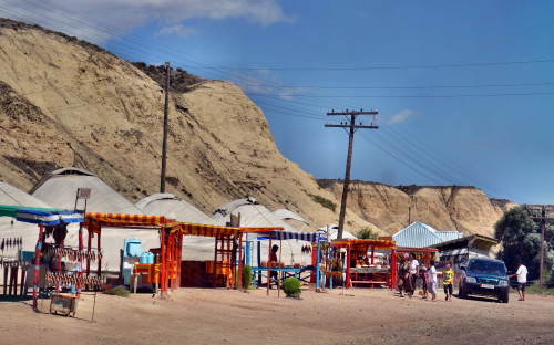 Der See gehört zum Biosphärenreservat Issyk-Kul. 500 Com (ca. 8,50 €) Ökosteuer kostet die Einfahrt. Für hiesige Verhältnisse vermutlich kein Pappenstiel. Wenn ich vergleiche: Habe gestern auf dem Markt in Bischkek für den gleichen Preis 1 kg Tomaten, 1 kg Paprika, 2 Brote (gelagert in einem 60er Jahre Kinderwagen), eine 3 kg-Melone, 500 g Gurken, 3 große Auberginen, 500 g Linsen und zwei Dosen Bier bekommen.