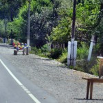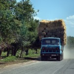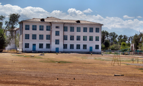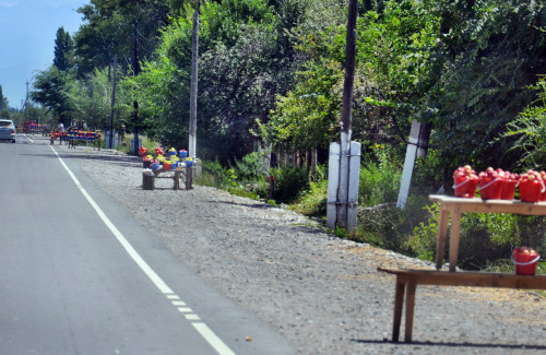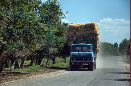 In Jurten am Wegesrand bieten kirgisische Frauen Dörrfisch, Kumys und Kurt an. Kumys ist gegorene Stutenmilch, Kurt sind kleine Knabberbällchen aus gegorener Stutenmilch. Ich hab beides versucht – widerliches Zeug, issi(k) nix für meinen westeuropäischen Gaumen. An anderen Straßenabschnitten bieten Anwohner das feil, was in ihren Gärten wächst. Diese Form des Straßenhandels werde ich in Deutschland vermissen. In fast allen Ländern die wir bereist haben, verkaufen die Menschen ihre Gartenfrüchte auf diese Weise. Dann gab‘s noch einen gut beladenen Heulaster, eine Schule und ein Selbstportrait vom Beifahrersitz.