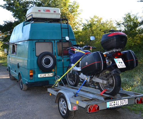 Am Wochenende gab es eine Testfahrt mit Bus, dem neuen Moped-Anhänger samt Moped. Richtig – die Eifel kann man nicht direkt mit dem Tian Shan vergleichen… aber irgendwo fängt jeder mal an. Der Rest bleibt Improvisation. Testurteil: Der Anhänger verlangsamt die Karre schon ein wenig. Hinsichtlich Flexibilität und Gewicht liegt er jedoch weit vor unserem alten Pferdeanhänger.